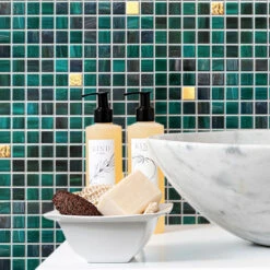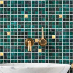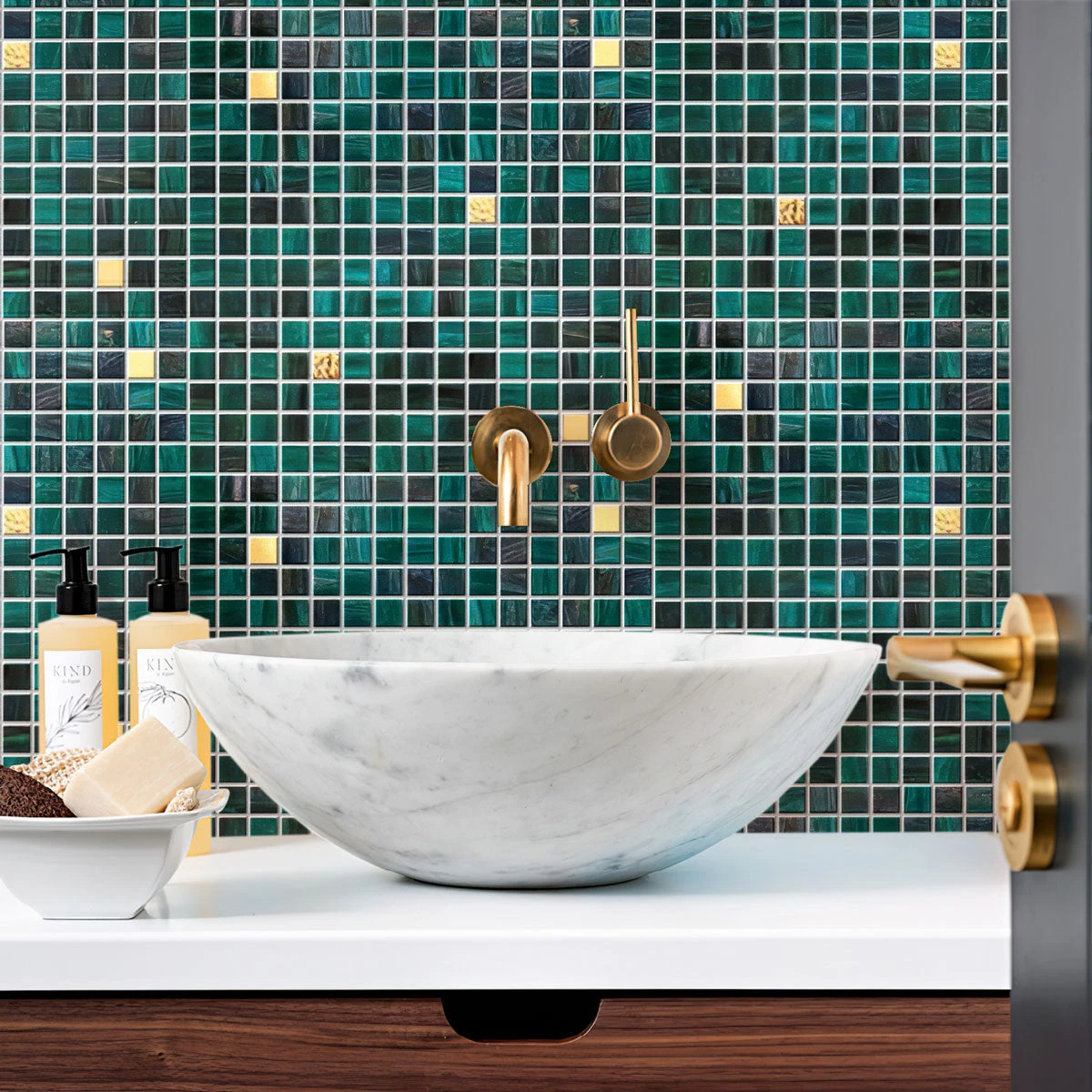 | Sold by: sheet Sheet Size: 12″ x 12″ Chip Size: 0.8×0.8″ Thickness: 1/4″ Mounting: Paper Facing Material: Glass Color: Green, Gold Recommended Adhesive: Laticrete Glass Tile Adhesive Lite Packing info: