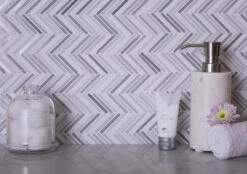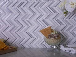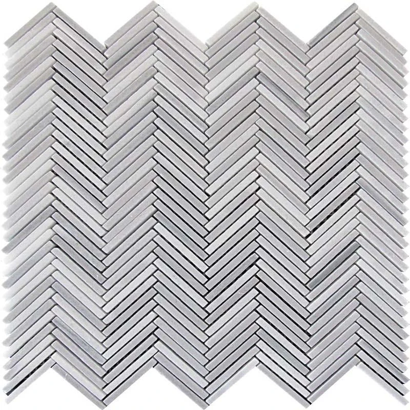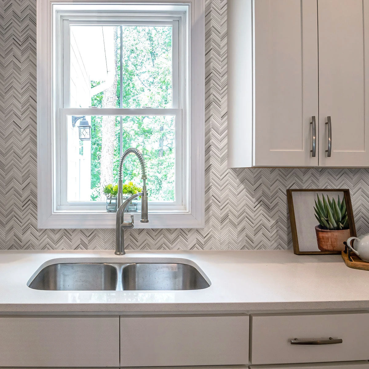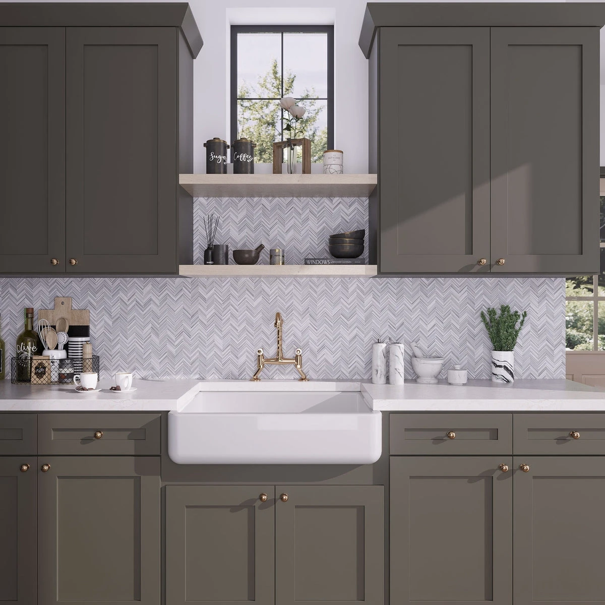 If you are looking for a sophisticated look with natural stone tiles but prefer some pattern, consider going with Sticks Equator herringbone pattern mosaic tiles. Equator marble tiles in small rectangular pieces are arranged in a herringbone pattern and laid on a mesh to form this unique mosaic tile that is an attention-grabbing piece. Equator marble is a white and gray marble with linear veins, quarried in Turkey. The parallel veining makes this marble tile so unique and distinct that you can easily create an eye-catching focal point on any surface. This herringbone pattern mosaic tile can give your kitchen or bathroom a classic feel while still enjoying a playful pattern. This pattern is a great choice for flooring due to grout lines that provide extra slip resistance. Herringbone backsplashes are as popular as the flooring in kitchens and bathrooms. They are the perfect opportunity draw attention on your walls and bring some added detail to a dull space. Due to the nature of stone, variations in color, pattern and veining may occur.