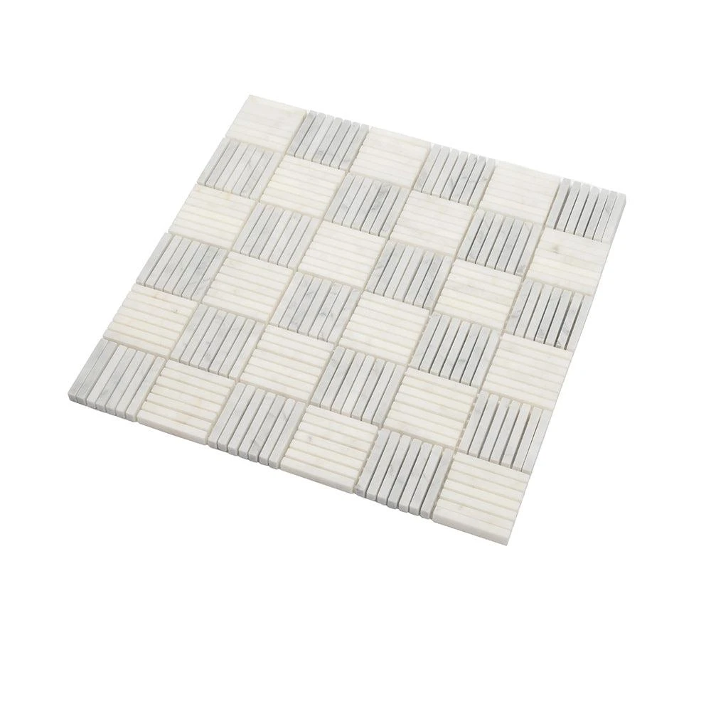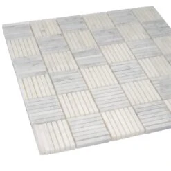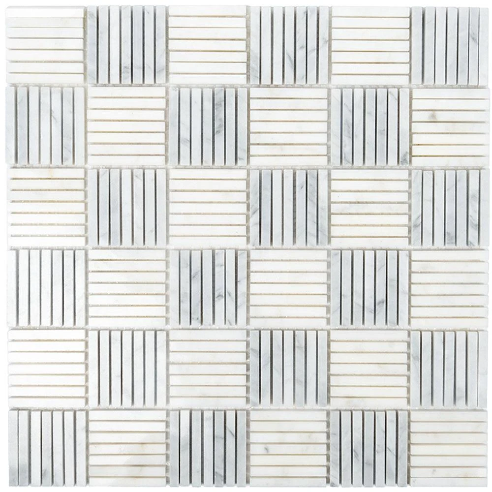 These square mosaic tiles offer a contemporary style and texturize your walls or floors with the beauty of Bianco Carrara marble. Individual tile inserts are designed to form the impression of squares that creates a unique geometric pattern. A pleasing mixture of different shades of whites adds even extra dimension to tile which is ready to beautifully showcase your unique style. These mosaic tiles are ideal choice for indoor and outdoor floors as well as wall installations including backsplashes, bathroom showers and accent walls. Due to the nature of stone, variations in color, pattern and veining may occur.