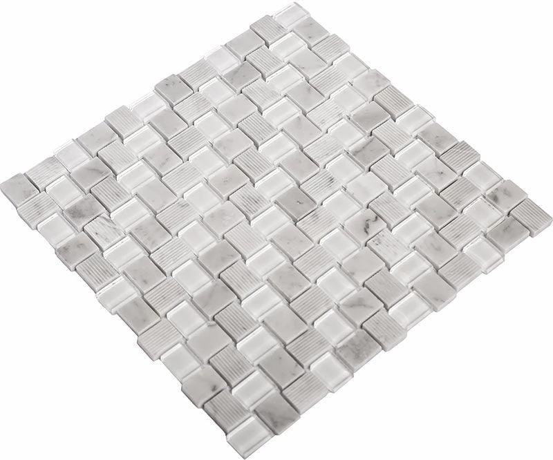 Basketweave mosaic tile is a great opportunity to showcase your personal style and add dimension to any surface. Rectangles are laid in horizontal and vertical ways onto the sheet, interlocking with one another for a seamless pattern. This mosaic tile is the update of a geometric concept by mixing Bianco Carrara marble and clear white glass pieces. A mix of different materials allows these mosaic tiles to be styled in either a traditional or contemporary way. Thanks to its glossy finish, these basketweave mosaic tiles in white color are perfect to add brightness and bring long-term beauty to your home. Create a clean, refreshing yet luxurious feel in your kitchen or bathroom walls, as well as interior floors especially where you prefer slip resistance.