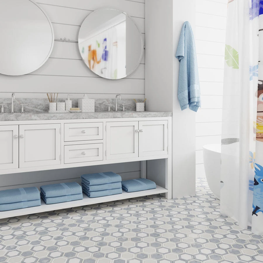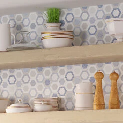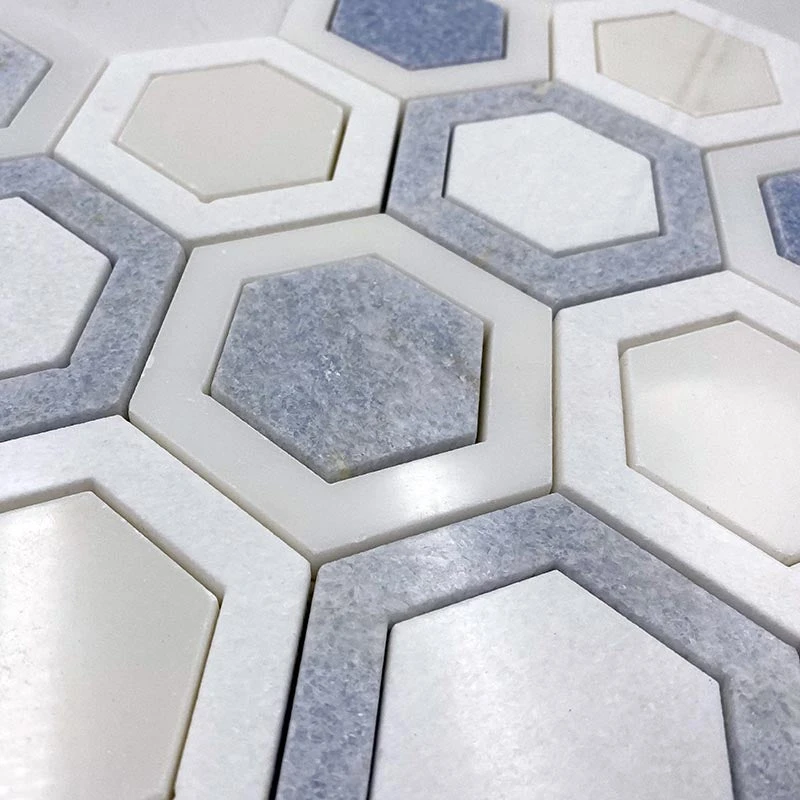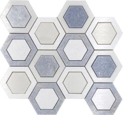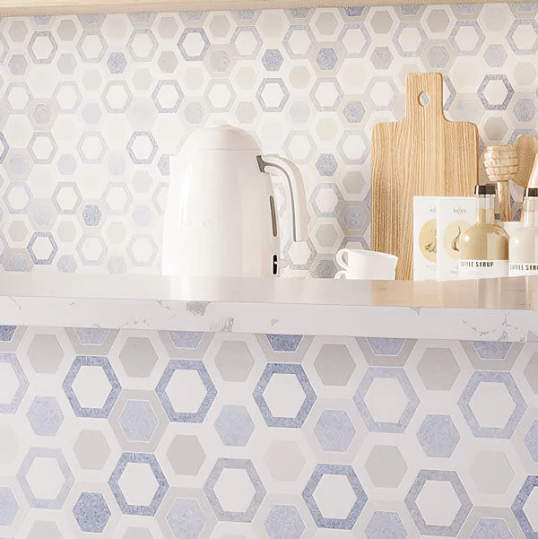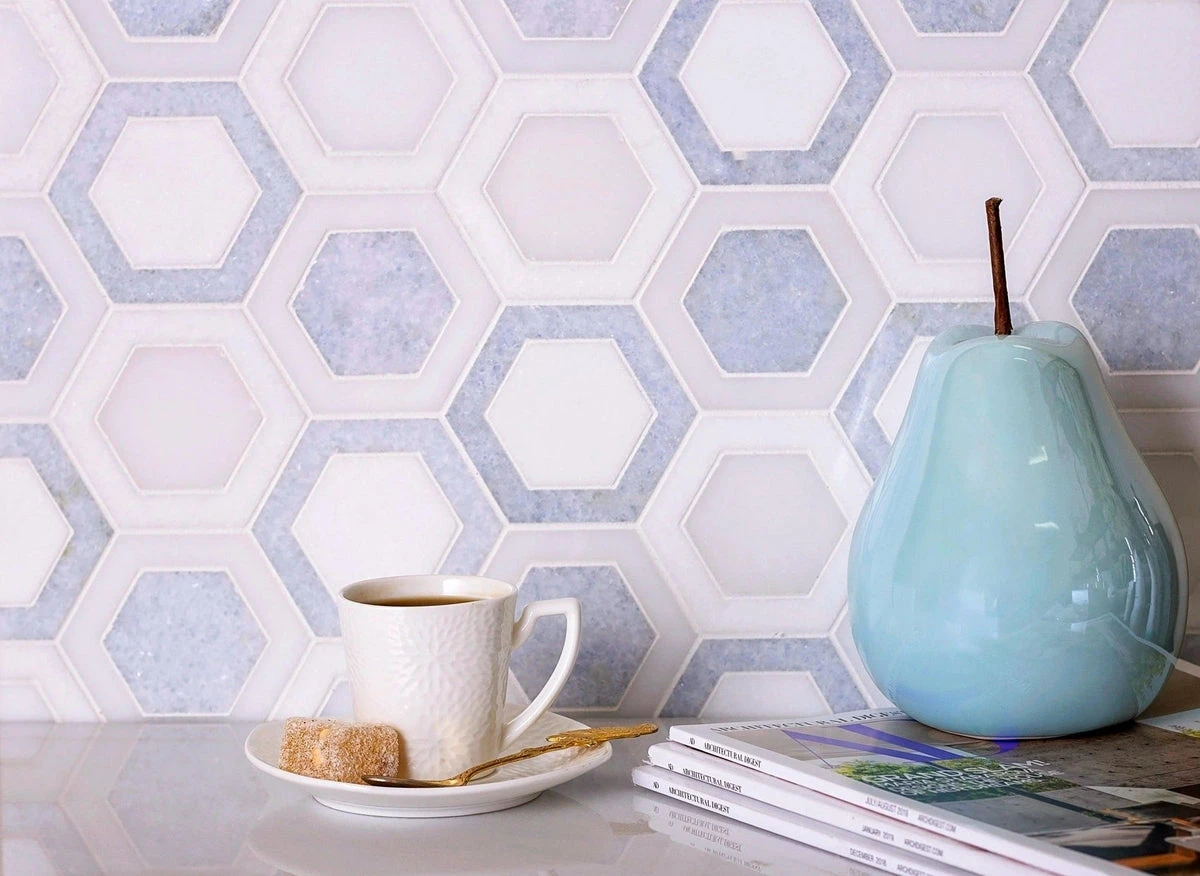 This beautiful combination of Thassos, Blue Celeste, and Paper White marble tiles* transform any home into a magnificent space. These hexagon tiles add fun and vibrance to a variety of settings including your kitchens, bathrooms, and living rooms. With a refreshing twist on the timeless classic marble, hexagon tiles give a unique yet simplistic look that can be blend into any décor from traditional to modern projects. Hexagon backsplashes can create wall decors that have clean lines and sharp angles, which gives the perfect twist to a contemporary design. You can also create an eye-catching hexagon floor tile for a more retro look or a mid-century modern style in modern, contemporary, or industrial style spaces. No matter where you choose to install, get the distinctive look with hexagon pattern marble tiles for decors that stand out.