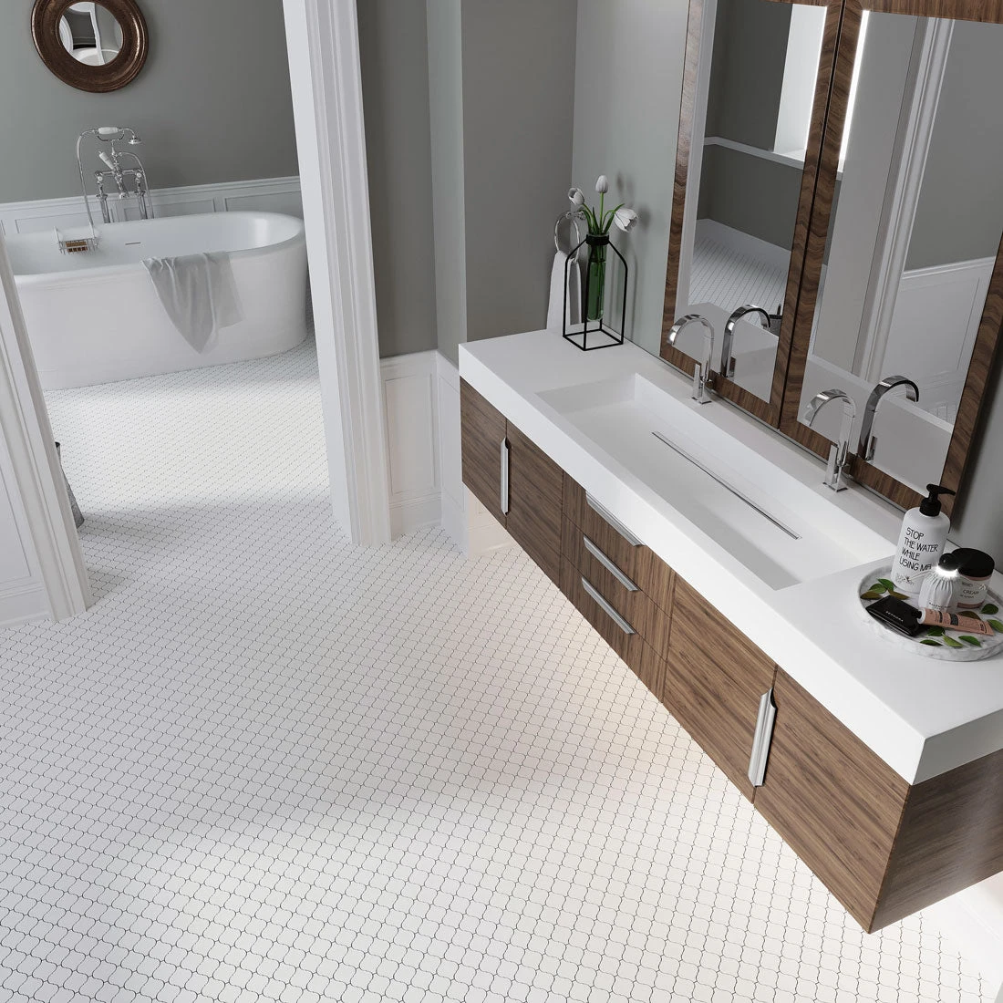 *Natural stone tiles, including marble, may display variations in color, finish, strength, and slip resistance. White marble may contain naturally occurring iron deposits that can lead to discoloration if used in areas prone to wet or damp, or if exposed to harsh chemical cleaners.