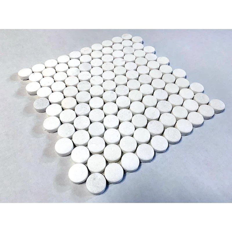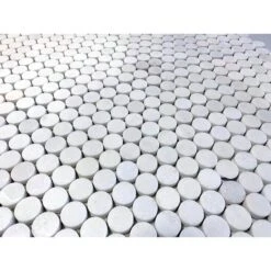 When it comes to white marble tiles for your home or business, it doesn’t get any more classic than our Thassos white penny round tiles! These 1” round mosaic tiles combine the timeless circular shape that is popular for white kitchen backsplashes and shower tiles with the luminous sheen of Thassos marble. They’re a gorgeous choice for a backsplash insert over your stove to pair with other white marble wall tiles, or a petite pattern for your flooring where you want to prioritize style and safety! The polished finish of these tiles allow the white marble to sparkle in natural light, giving your home a luminous glow that will dazzle on your bathroom wall or in a walk-in shower! It’s a gorgeous interior pick for floors throughout your home, as well as in a commercial setting! Whether you’re sticking with white cabinets and counters to create a light and airy farmhouse kitchen, or want to pair it with bold paint colors like Classic Blue or patterned wallpaper, they’re a classic way to add tile elements throughout your home with the long-lasting beauty and style of white marble.