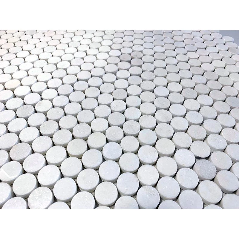 These gleaming white marble penny round tiles are sold by the sheet, each measuring 11.2″ x 11.5″. They’re mounted on a mesh backing to add flexibility when installing.