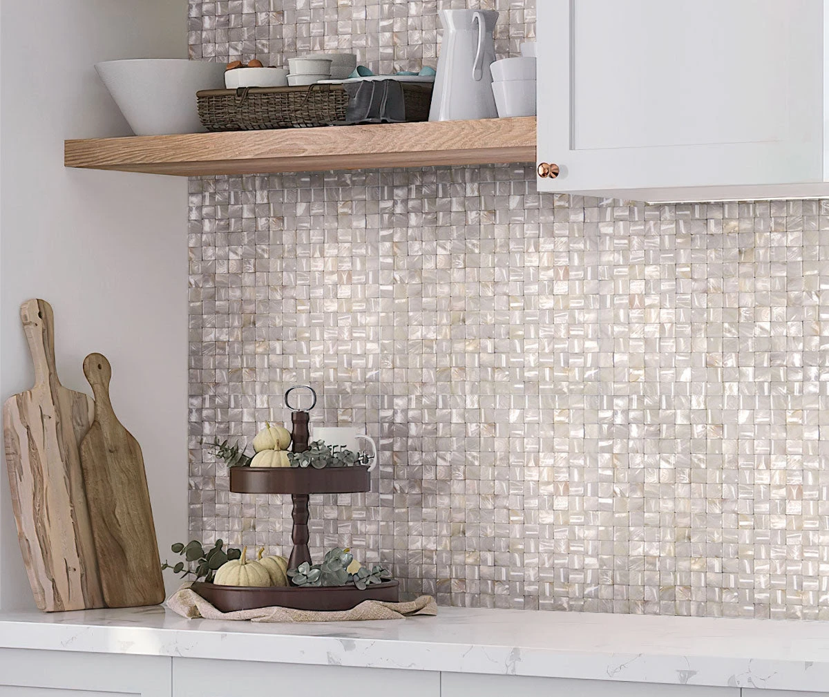 Bring a breeze of freshness to your home with our Tight Joints pillow tile. Its unique shape creates a volumetric dimensional feel able to enhance any indoor project. Classic basket weave pattern brings up various angles of a Mother of pearl tile and shows iridescent hues of light reflections. Minimalist beige mosaic color fits any palette and can be a perfect solution for any traditional and contemporary design. These pillow texture mosaic tiles are backed on a mesh to simplify the installation process. Whether you want to add some movement to a simple design or bring air to a limited area, use this product for walls, floors, backsplashes, mirror frames, accent borders, niches. Thanks to the durability of shell this opalescent tile will never fade and will enhance any bathroom, kitchen, living room, dining room or any other area for many years long.