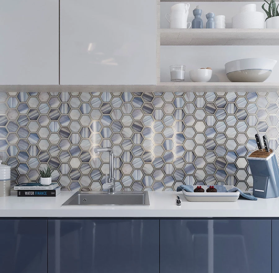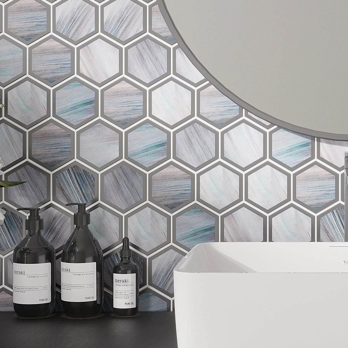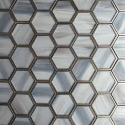 Add shine and flair to your home with these Topaz Marbled Glass Hexagon Mosaic Tile! The stunning pattern in each glass hexagon resembles the striation patterns found in natural gemstones – they’re a gorgeous and sophisticated finish for someone looking to elevate a classic hexagon tile pattern! The semi-precious stone shimmer of these glamorous glass tiles is accented by a thin metallic border to set off the gorgeous color o the glass mosaic tiles. These creative tiles are a stunning way to add character and charm to a wall installation for an elegant kitchen, designer bathroom, creative shower, or intriguing living room design! Topaz Marbled Glass Hexagon Mosaic Tile are a stunning detail with the natural glamour of gemstones and the versatility and durability of glass tiles.