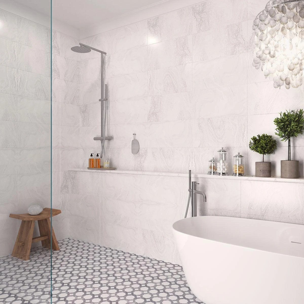 Refresh your home interior design with our beautiful Varana Blanco Stone Look White Porcelain Tile! This white porcelain tile creates a sophisticated look with a white base and subtle gray marbled design that instantly enhances any surroundings. White large format tiles with a polished finish can visually maximize your space and bring an airy, open feel to even a small room. This product is approved for light traffic floor applications as well as higher traffic flooring such as a commercial or hospitality setting. It is a brilliant tile for walls – use it for a white porcelain tile backsplash in your kitchen or bathroom, create an elegant niche, or a feature wall with minimal grout lines. It is approved for moisture-prone areas as well, making it a gorgeous and low-maintenance choice for wet rooms. Use these large tiles for shower walls, bathtub surrounds, bathroom backsplash, or other designs.