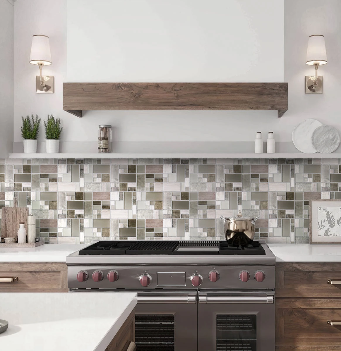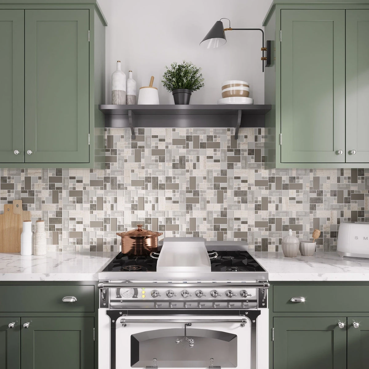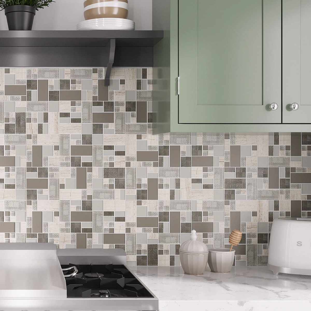 | Sold by: Sheet Sheet Size: 11.7″ x 11.7″ Chip Size: 1.9″ x 1.9″ + 0.9″ x 1.9″ + 0.9″ x 0.9″ Material: Glass, Stone Color: White, Beige Finish: Polished, Matte, Textured Mounting type: Mesh Mounted Recommended Adhesive: Laticrete Glass Tile Adhesive Lite Packing info: