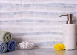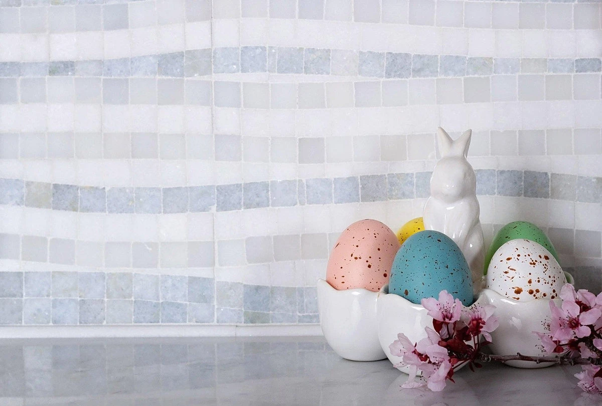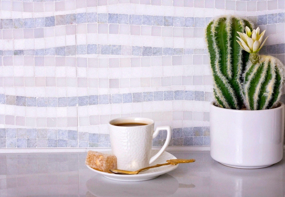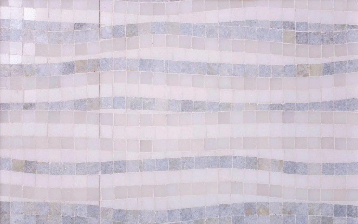 The striking design of these white and blue marble tiles represents the sensation of waves with an artistic flair in design. Suitable for wall and floor applications, these marble tiles consist of carefully cut marble pieces to achieve a unique wavy look and evoke the rhythm of the ocean. Lines between the mosaic tiles are designed to blend seamlessly with each other for a continuous pattern. The perfect combination of various colors and shades offers all the elegance and luxury you expect from fine marble. These mosaic tiles offer versatile design opportunities, from traditional to contemporary. Bring the natural beauty to your bathroom walls, kitchen backsplash, and much more with this attractive patterned marble tile.