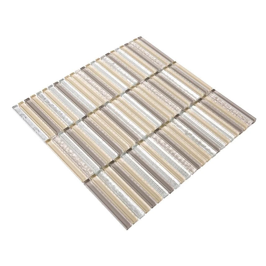 | Sold by: Sheet Sheet Size: 11.8″ x 11.8″ Chip Size: 0.2 x 3.9″/ 10 x 98 mm Width: 11.8″ Length: 11.8″ Chip Size: 0.2″ x 3.9″ Chip size mm: 10 x 98 Thickness: 5/16″ Material: Glass Color: Beige, Silver Finish: Glossy Mounting type: Mesh Mounted Recommended Adhesive: Laticrete Glass Tile Adhesive Lite Packing info: