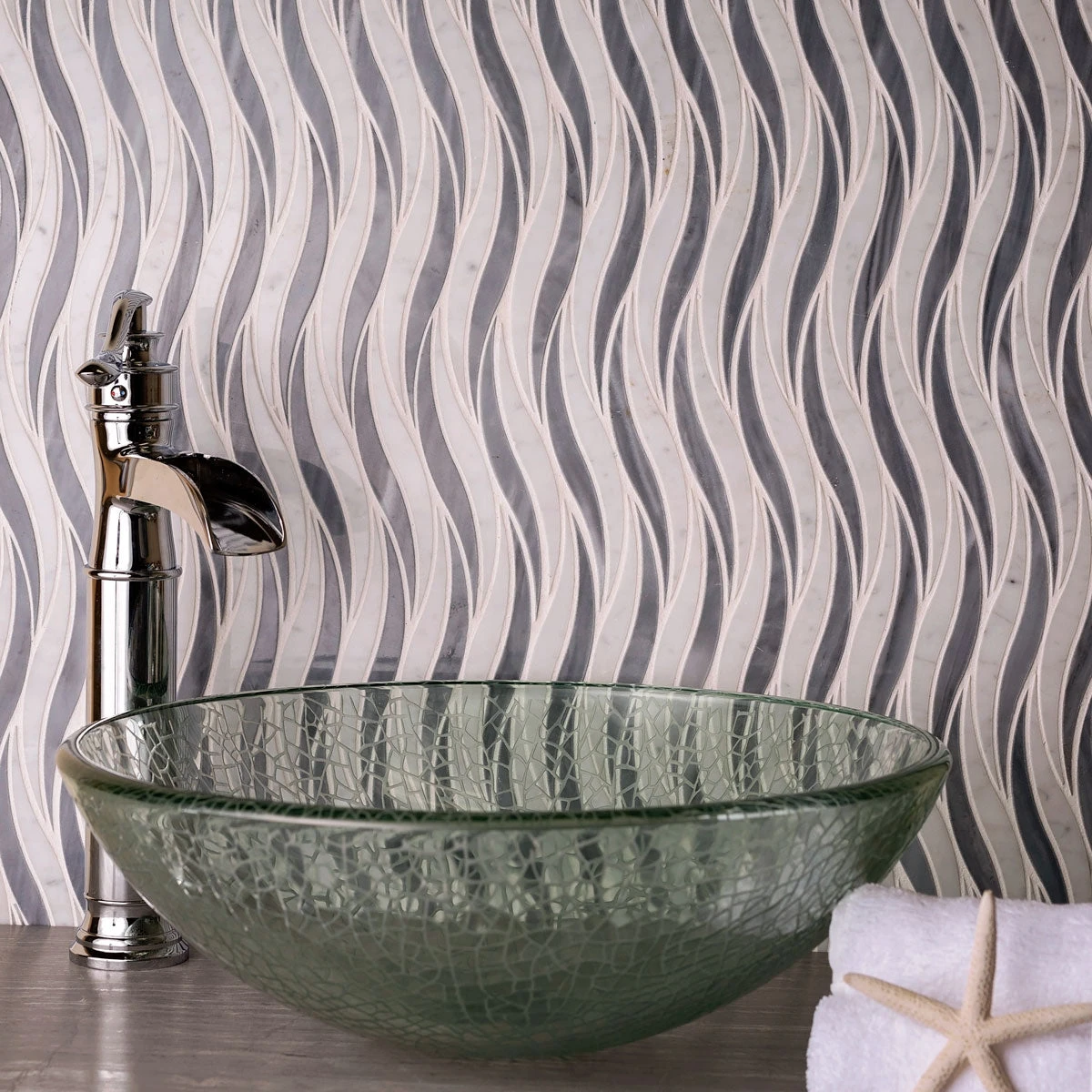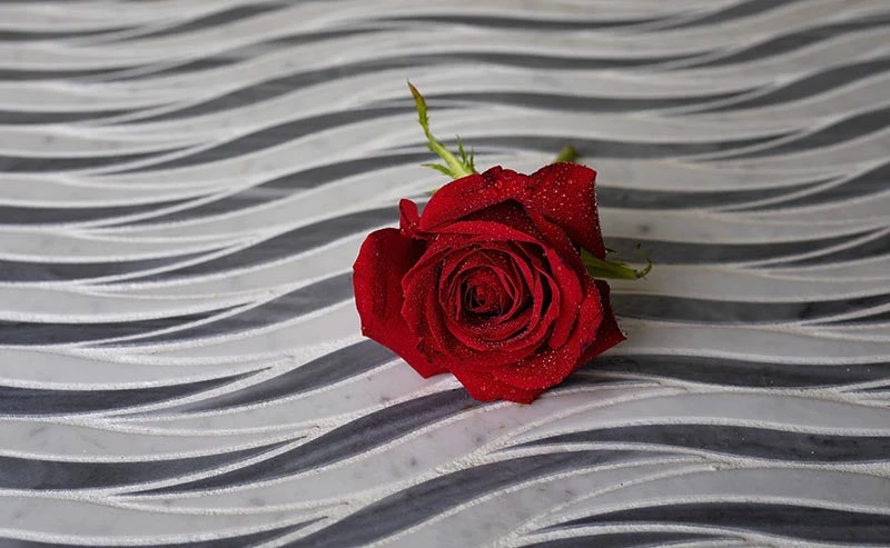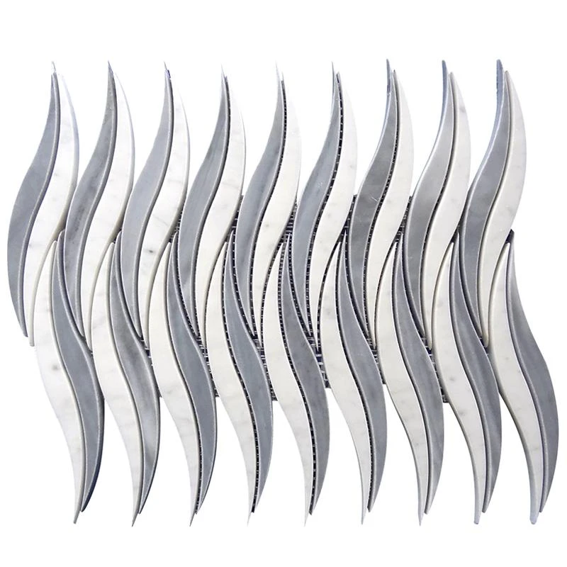 Liven up your home with a dazzling wave of this unique waterjet tile design. White and gray mosaic colors follow recent tile design trends and match any style. Installed vertically, the pattern raises the ceiling and adds height to the space visually making the room appear larger. These marble tiles are sustainable, stain-resistant, long-lasting and do not require any special maintenance, which makes them a popular bathroom tile for walls or floors. All sheets are interlocked and will not trouble the installation process. Whether you use them for an interior or exterior design, these tiles will be a great addition to any project. Install them to your kitchen, shower, steam room, foyer or patio. Revamp your space with a wave tile backsplash, floor, walls or any accent piece you can imagine.