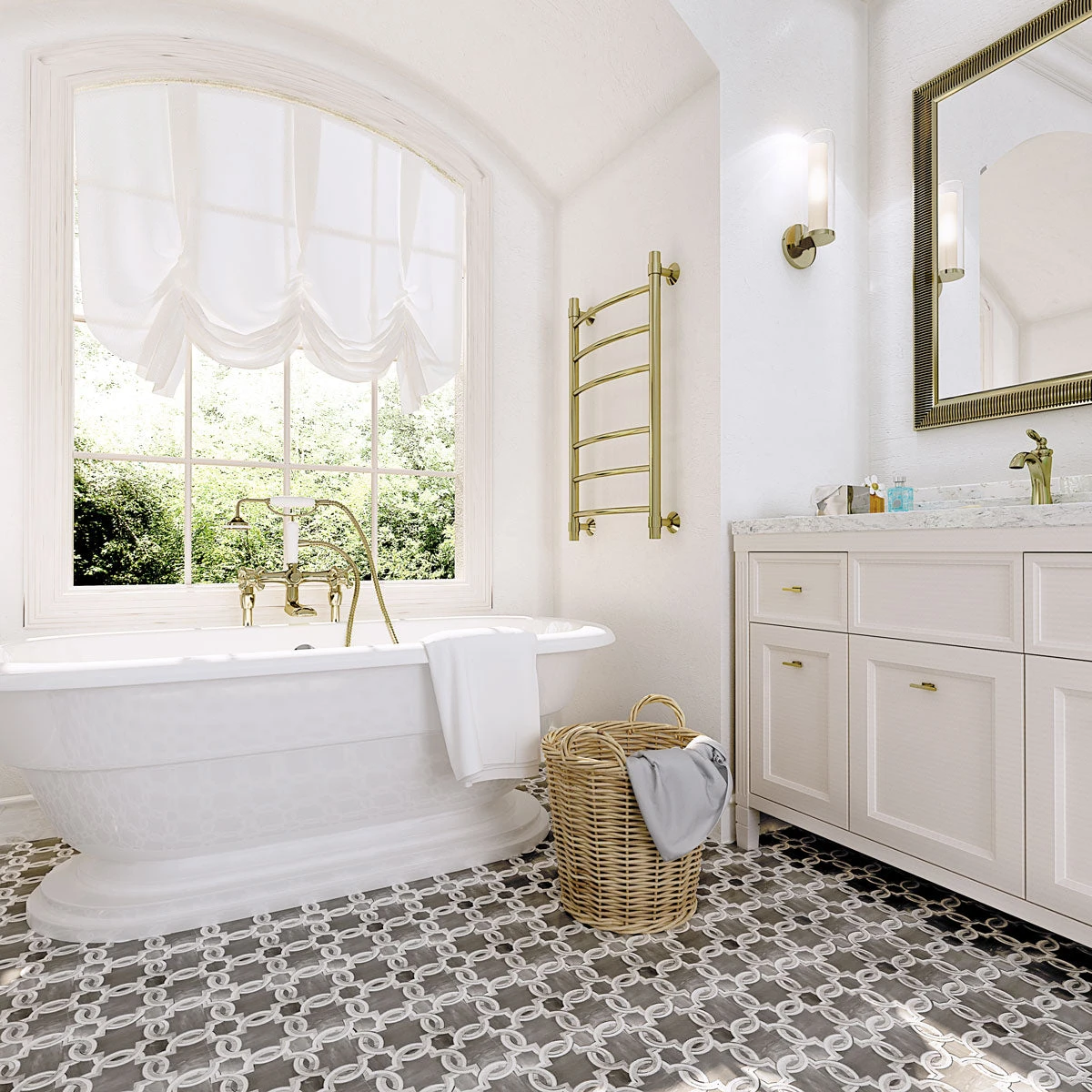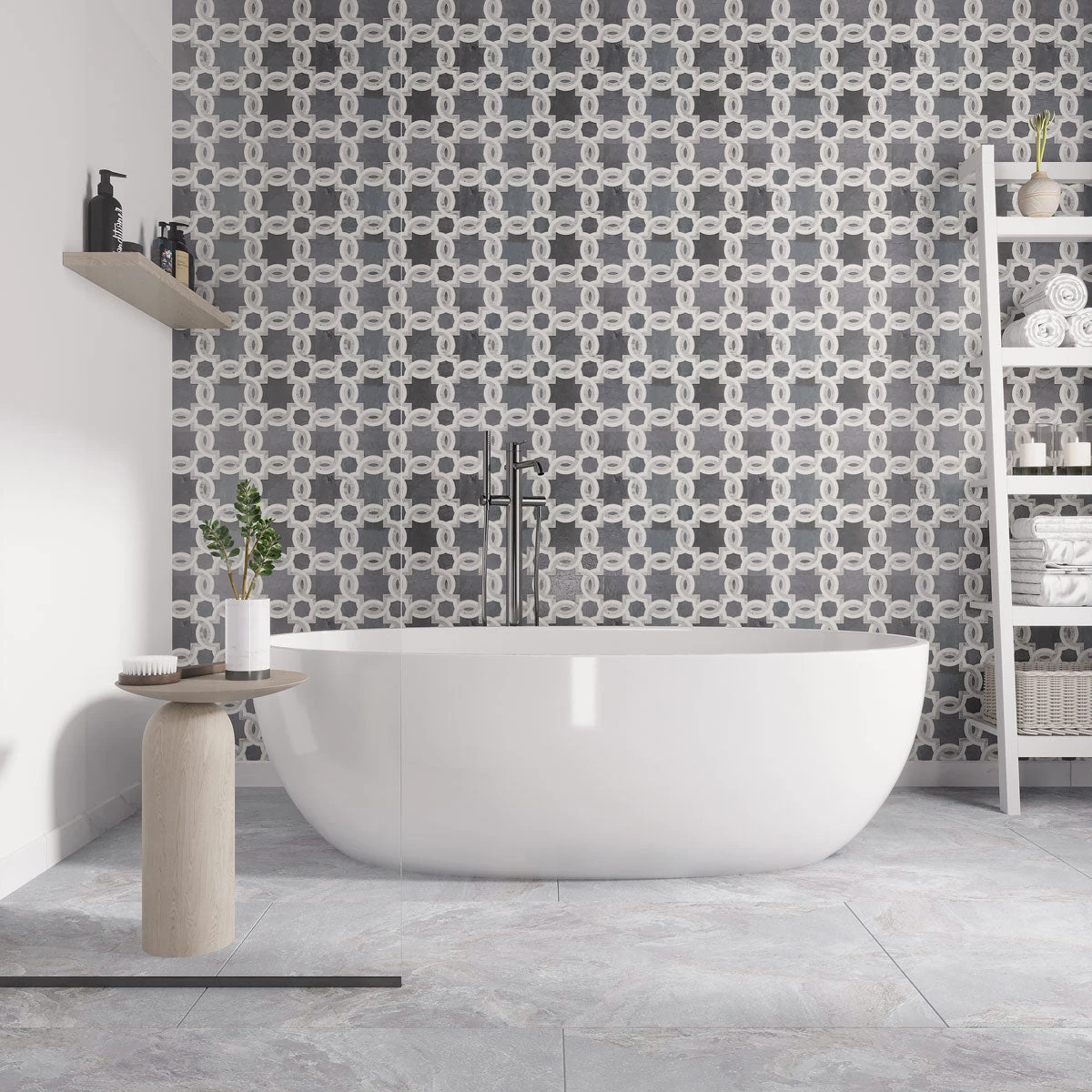 The intricate detailing of this flower tile adds depth and warmth to bathroom settings and can easily be complemented with your favorite colors, finishes, and textures to achieve the exact aesthetic you want. For a characterful modern farmhouse style, team this patterned tile with deep rustic wooden finishes — or with bright white cabinetry for a classical design statement. Use it as your vanity backdrop, shower walls, and niches, tub surround, or install on both the walls and floors for a consistent, seamless flow.
