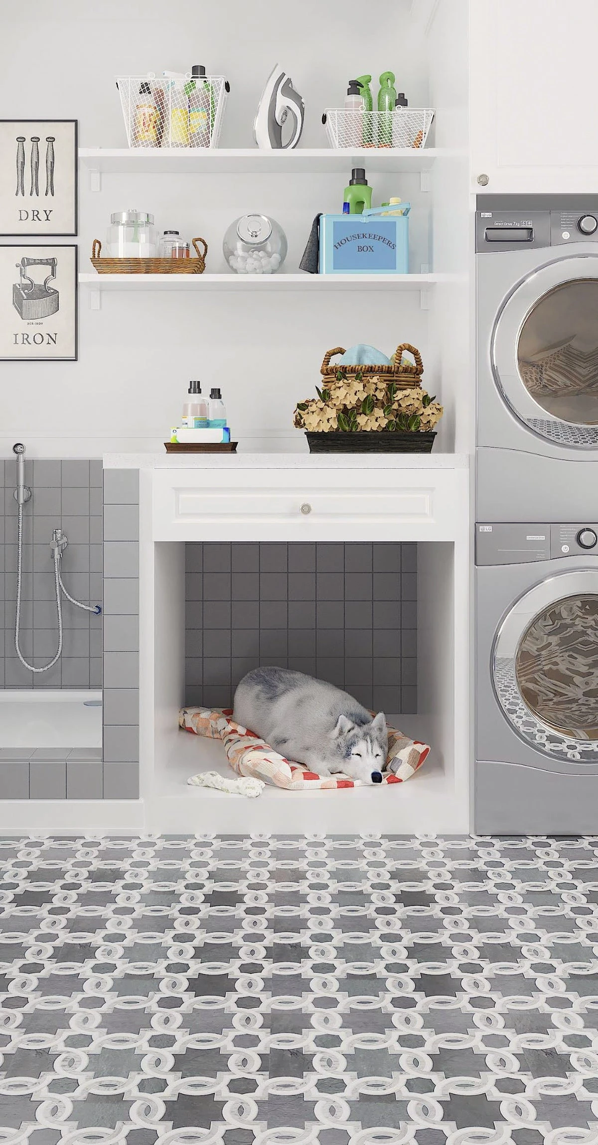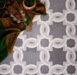Our Thassos and Carrara marble tile can be used to craft a stunning statement room — and in an open space, like an open plan dining and living room, it works brilliantly well as a way to fill a larger wall. If you’d like to introduce flower tile but don’t have the luxury of space, you can always create an eye-catching accent wall. To further enhance this accent wall, pair with complementary colors inspired by your floral-patterned tile. For example, you can choose the gray from the floral print and apply a similar shade to the rest of the walls for a tone-on-tone finish.