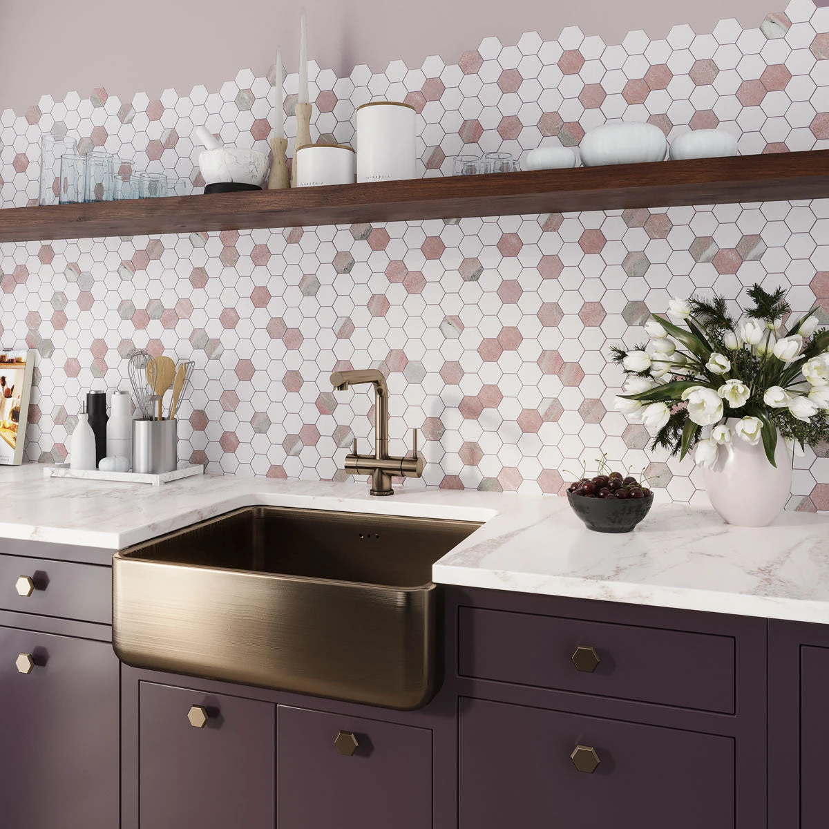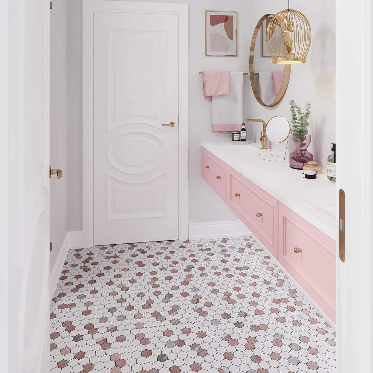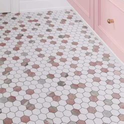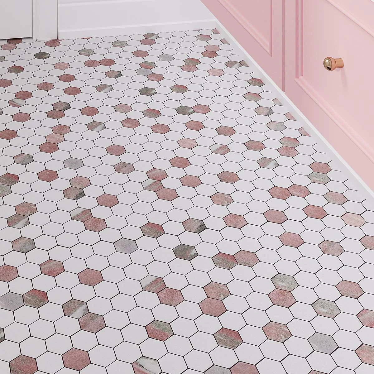 Pink Norwegian Rose and white Thassos marble combine in this lovely hexagon mosaic tile. Perfect for a kitchen backsplash, bathroom wall or floor, or any indoor or outdoor surface, this natural stone tile adds Scandinavian flair to any interior style. Our Norwegian Rose and Thassos White and Pink Marble Hexagon Mosaic Tile brings the beauty of the outdoors inside with a romantic pink, white, and gray marbled design. It’s perfect for adding a touch of romance to any space, whether it be indoors or out. And because it’s a mosaic tile, it’s also ideal for backsplashes, bathrooms, and showers. So if you’re looking for a unique and stylish way to update your home, this is the tile for you!