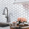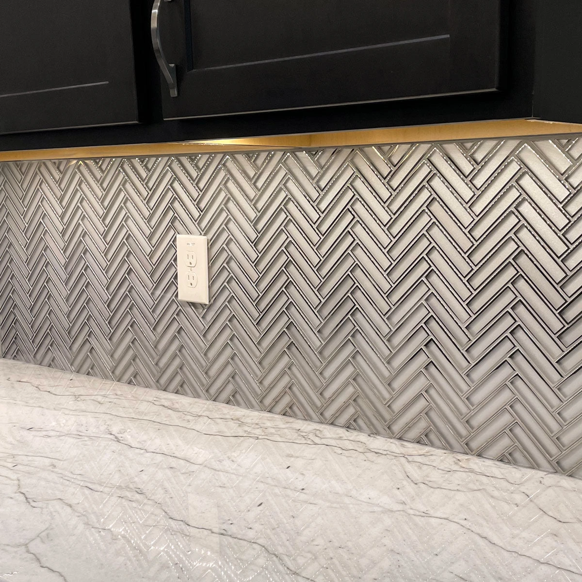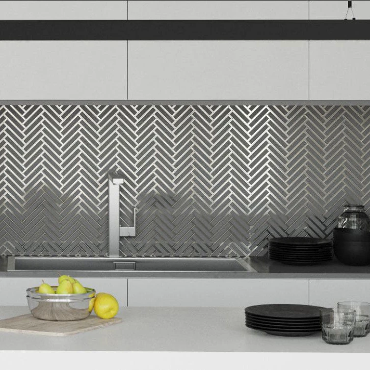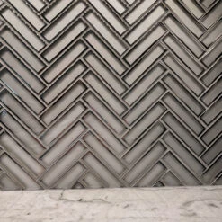 Love the look of herringbone glass tile but want a little something extra? We’ve got the perfect design solution with our White Deco Herringbone Glass Mosaic Tile! The frosted white glass and polished silver finish creates an Art Deco-inspired design that brings to mind Old Hollywood elegance, vintage glamour, and pearly white details above all! This glass mosaic tile is laid on mesh sheets measuring 11.2″ x 11.8″ and fits seamlessly together to allow for an easy pattern layout. Use it as a decorative border for a creative shower wall tile in white and silver, a metallic trim detail for your kitchen backsplash, or a herringbone tiled fireplace!
