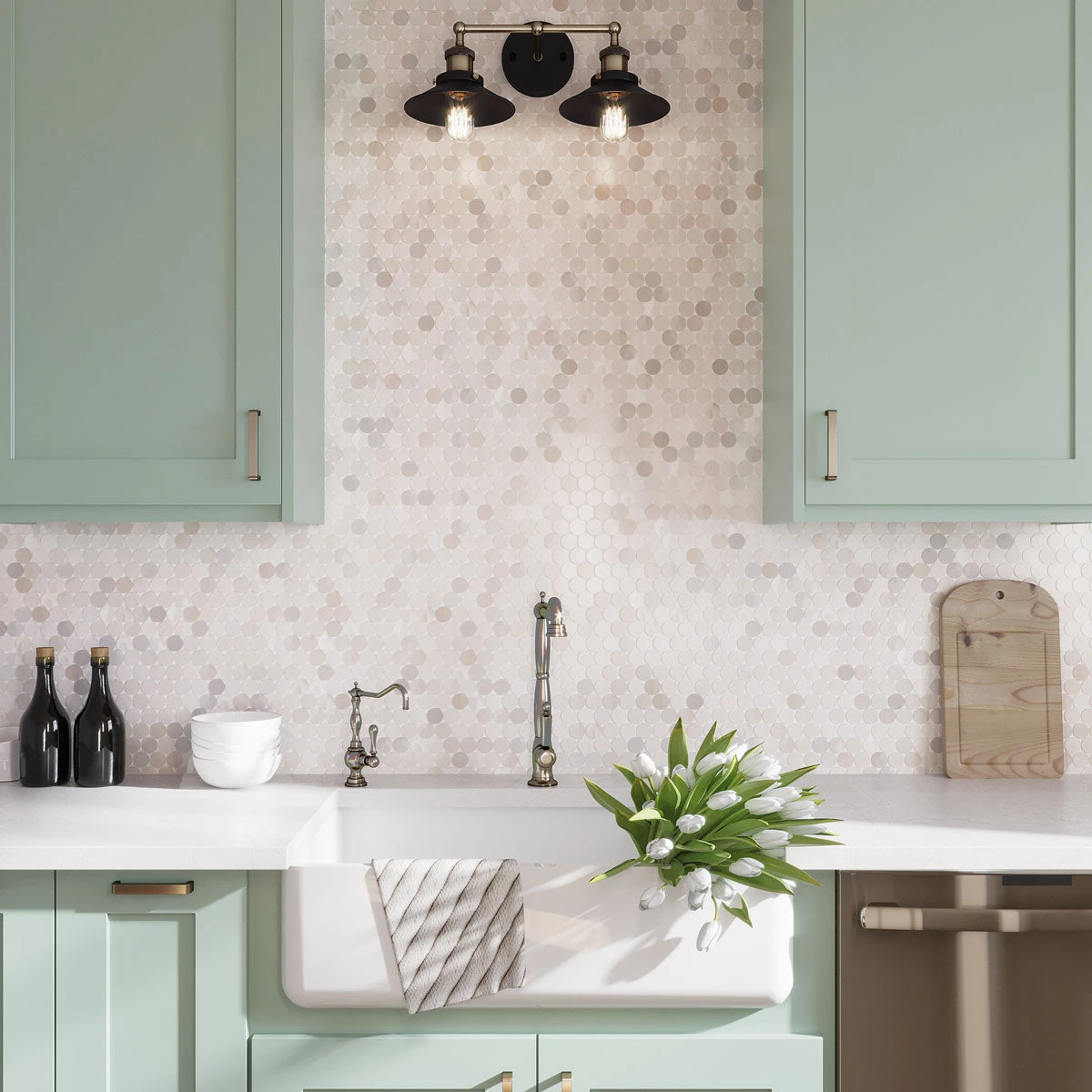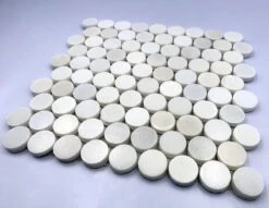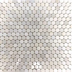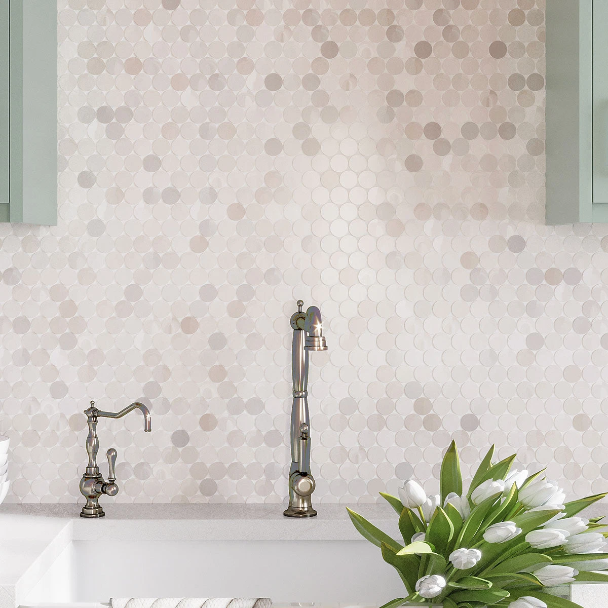 Want to shake things up when it comes to classic Penny Round mosaic tiles? These Eastern White Polished mosaic tiles are an oversized version of the timeless round design, adding a marble large format look to your round backsplash tile for a modern kitchen design, or to add a safe flooring option for your shower or entryway.