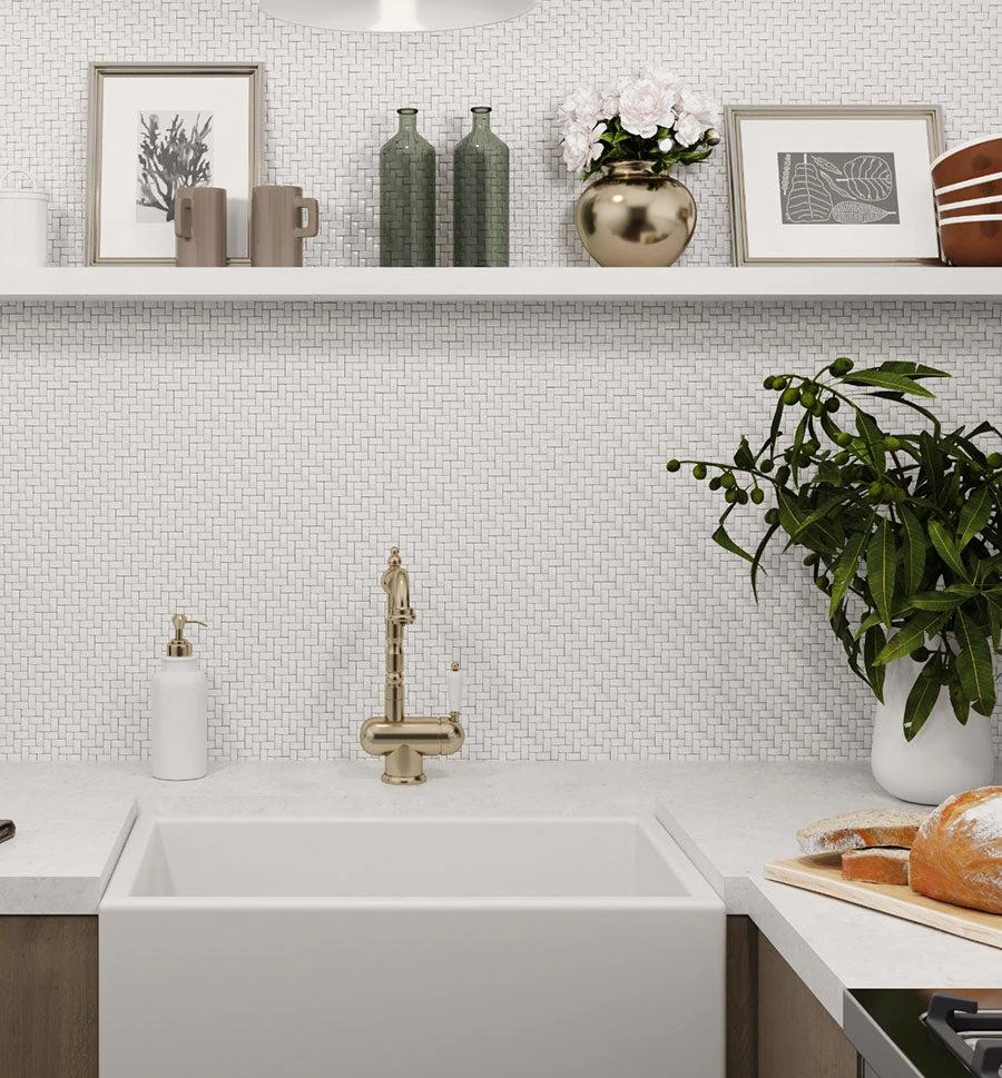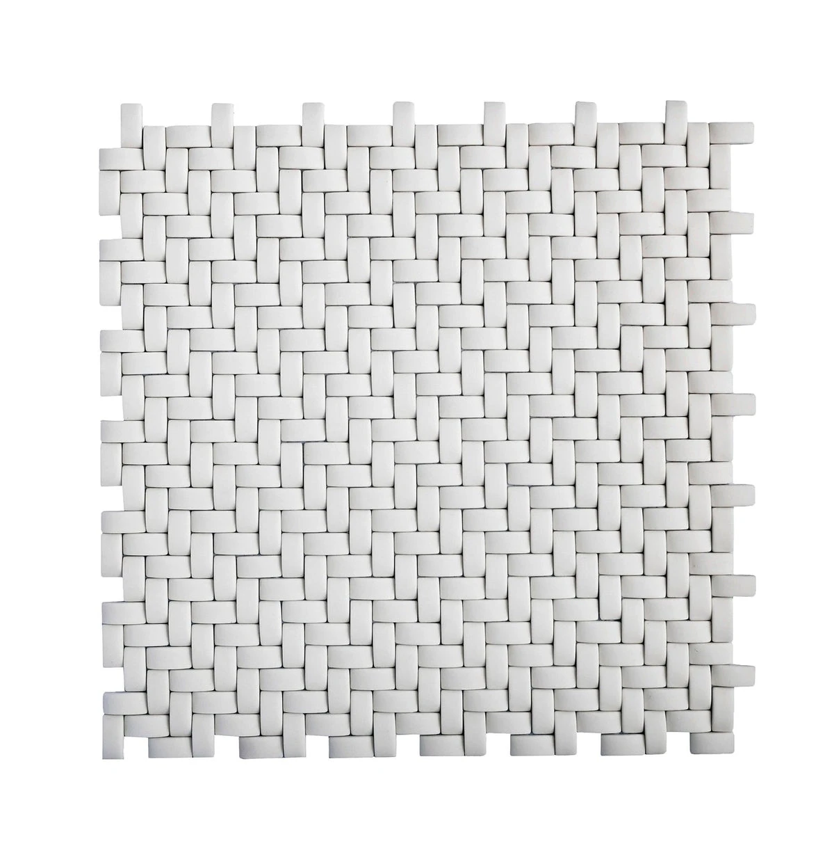 | Sold by: Sheet Sheet Size: 11.7″ x 11.8″ Chip Size: 0.45 x 0.9″/ 11 x 22 mm Thickness: 15/64″ Material: Recycled Glass Color: White Finish: Matte Mounting type: Mesh Mounted Recommended Adhesive: Laticrete Glass Tile Adhesive Lite | Area of use: