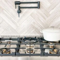 Wood-look tile is a great option to create kitchen backsplashes in contemporary designs but you can actually go for rustic or glam style too! It’s the natural beauty of the wood graphic that makes this tile such a versatile choice to complete the look of any space. See it used in a project by MM-Eight Design below that utilized the neutral finish of this honed marble tile to create a stunning herringbone subway tile backsplash! The Wooden Grey marble added beautiful detail to floating kitchen shelves, stainless steel appliances, and stunning Magnolia Farms decor designed by Chip and Joanna Gaines. The result is a modern farmhouse kitchen that is sure to inspire!